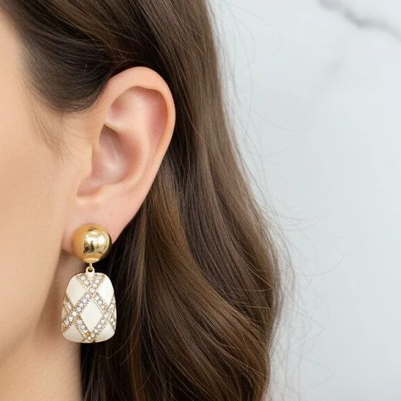 این گوشواره آویز شیک، تلفیقی جذاب از سادگی هندسی و جزئیات پر زرق و برق است. بخش بالایی، یک توپک (گوی) طلایی براق است که به یک پلاک مربعی متصل میشود. پلاک مربعی با میناکاری سفید (یا لعاب کرم/صدفی) پوشیده شده و روی آن با خطوط ظریفی از نگینهای درخشان (زیرکنیوم) طرح لوزی ایجاد شده است.