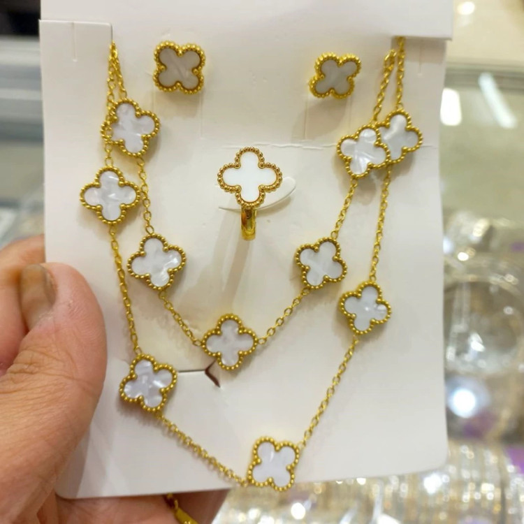 این سرویس شیک و چشمنواز، برگرفته از طرح محبوب و کلاسیک ونکلیف است که همیشه جزو انتخابهای لوکس و پرطرفدار در دنیای اکسسوری بوده. سرویس شامل گردنبند، دستبند، انگشتر و گوشواره است و با استیل باکیفیت و آبکاری قوی ساخته شده تا درخشندگی خود را در استفاده روزمره از دست ندهد.