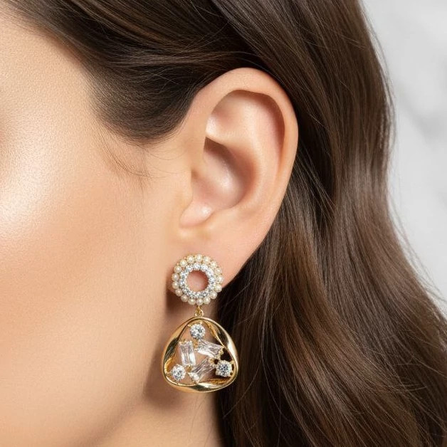 این گوشوارهی مدرن و منحصر به فرد، یک ترکیب هنری از قاببندی فلزی و درخشش کریستالی است. طراحی آن با الهام از معماری و فرمهای هندسی، بسیار فشن و خاص است. پایه پرنگین: گوشواره با یک پایهی حلقوی کوچک که کاملاً با نگینهای ریز پوشیده شده، روی گوش ثابت میشود. آویز هندسی: آویز اصلی، یک قاب فلزی توخالی به شکل مثلث یا فرمی شبیه به قاب عکس است که درون آن چندین کریستال درشت و تراشخورده به صورت آزاد یا با اتصالهای پنهان قرار گرفتهاند. جلوهی بصری: کریستالهای داخلی، با هر حرکت کمی میلرزند و نور را از زوایای مختلف بازتاب میدهند و حسی از آزادی و درخشش چندوجهی ایجاد میکنند. استایل: مناسب برای استایلهای مدرن، کوکتل پارتی، نمایشگاههای هنری و لباسهای شب با یقه ساده. این گوشواره، هنر درخشش را به شکلی متفاوت به شما معرفی میکند.