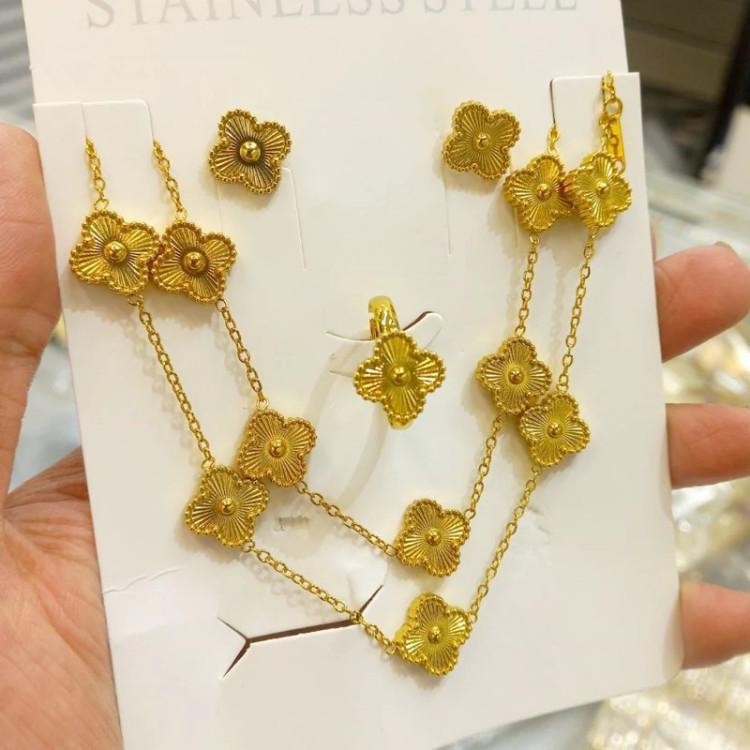 سرویس ونکلیف طلایی استیل رنگ ثابت 4 تیکه گردنبند.دستبند.انگشتر . گوشواره